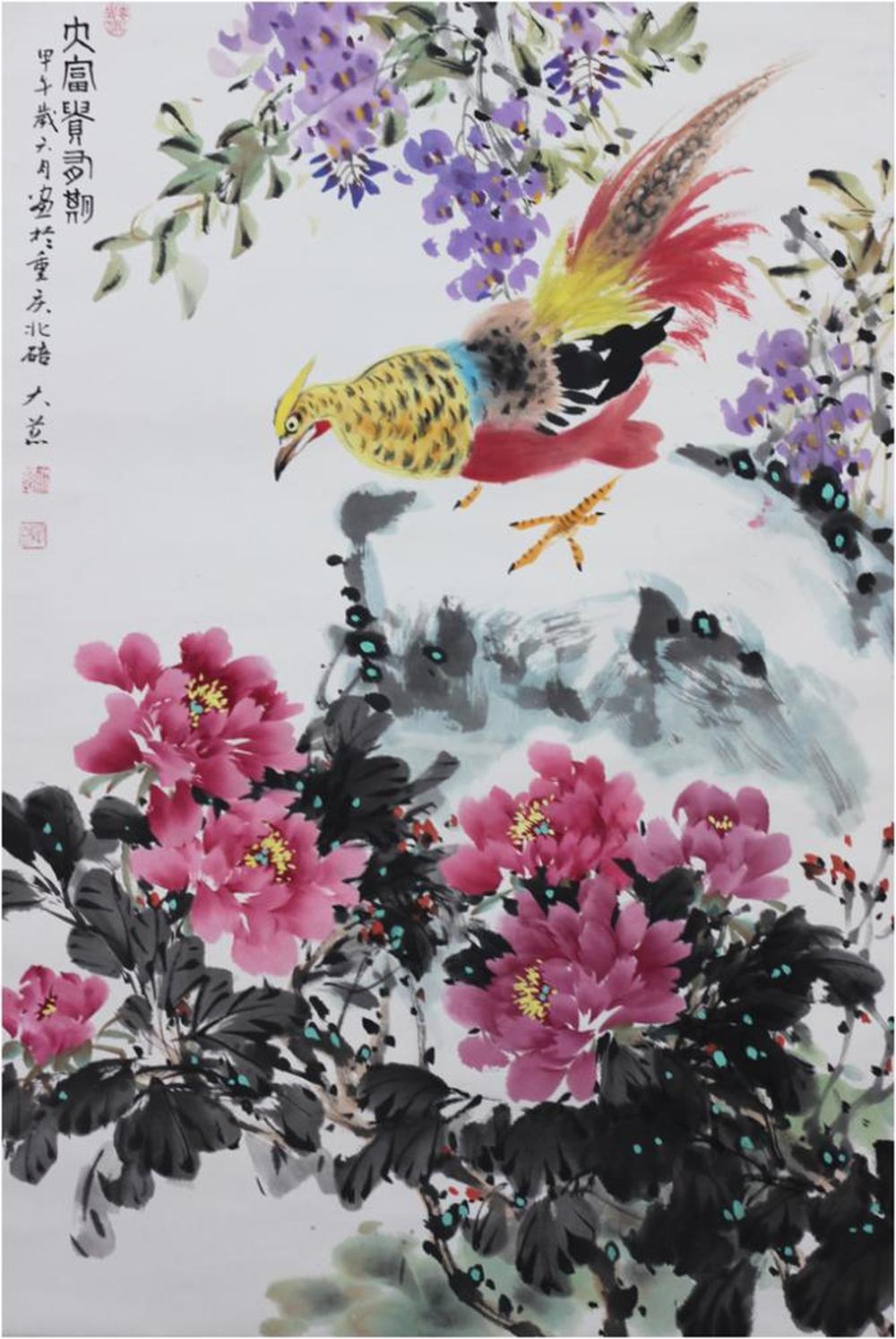 大富贵有期,拟白石老人画题之意。其中牡丹花寓意富贵,开六朵寓“六六大顺”,紫藤花寓意祥瑞,四串寓“事事如意”。锦鸡寓意“前程锦绣”。此画作于2014年高考期间,实乃为祝福高考学生之作。其中“墨缘”一印故意倒置,意即“有缘”,与富贵有缘,呼应画题。